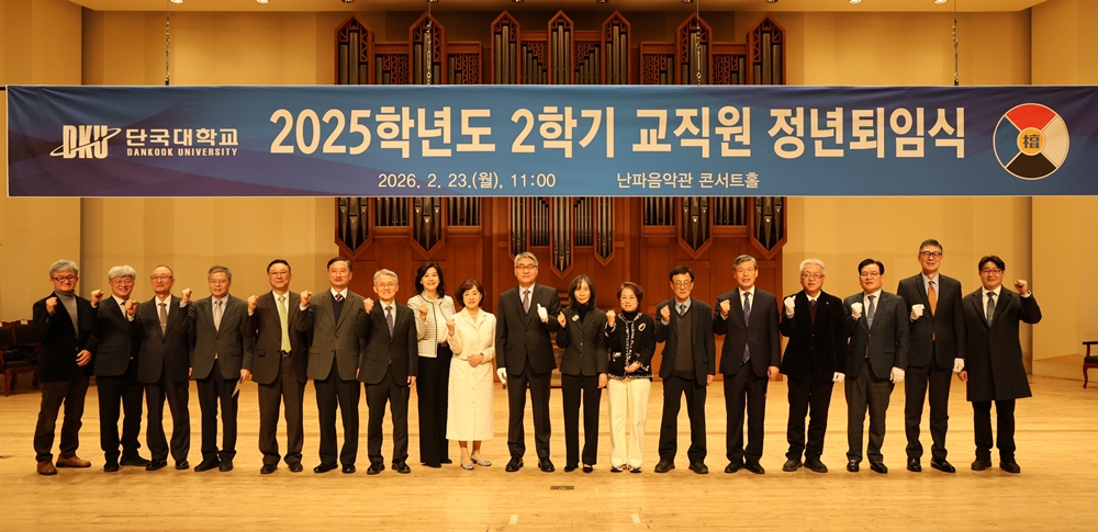 우리 대학의 발전을 위해 헌신해 온 교직원 25명(교원 18명·직원 7명)이 정든 교정을 떠난다. 23일(월) 죽전캠퍼스 난파음악관 콘서트홀에서 2025학년도 2학기 교직원 정년퇴임식이 열렸다. △정년퇴임 교직원과 교내 관계자들이 기념촬영을 하고 있다. 이날 행사에는 안순철 총장을 비롯해 백동헌 천안부총장, 김재일 대외부총장, 오좌섭 산학부총장, 이영희 교수회장, 조영식 직원노동조합위원장 등 주요 보직자와 퇴임자 가족, 동료, 제자들이 참석해 그간의 노고에 감사를 전하고 새로운 출발을 축하했다. 안순철 총장은 교육·연구·행정 등 각자의 자리에서 대학 성장에 기여한 공로를 기리며 퇴임 교직원들에게 공로패와 정부포상을 수여했다. △안순철 총장이 정년퇴임 교직원들에게 공로패와 정부포상을 수여하고 있다. 안 총장은 식사에서 “교육·연구·행정 각자의 자리에서 맡은 바를 든든히 지켜온 책임감과 열정은 대학 성장의 밑거름이 됐다”며 “여러분의 역사가 곧 대학의 역사이며, 이는 대학 창학 100년을 여는 기반이 될 것”이라고 말했다. 이어 “퇴임 이후의 시간이 삶의 새로운 여정을 완성하는 소중한 시간이 되길 바란다”고 덧붙였다. △안순철 총장이 정년퇴임 교직원들에게 감사의 인사를 전하고 있다. 34년간 학문과 교육에 헌신한 이재훈 교수(건축학부)는 “학교의 든든한 지원 속에서 학생들을 가르칠 수 있었던 시간은 제 인생의 큰 행운이었다”며 “퇴임을 끝이 아닌 새로운 출발로 삼아 삶의 또 다른 여정을 시작하고자 한다”고 소회를 밝혔다. 대학 행정 발전에 헌신해온 김희영 선생(자유교양대학 교학행정1팀)은 “39년간 대학의 성장을 곁에서 지켜보며 소임을 다할 수 있어 영광이었다”며 “앞으로도 대학의 발전을 늘 응원하겠다”고 말했다. ▷정년퇴임 교직원 명단 / 정부포상 교직원 명단