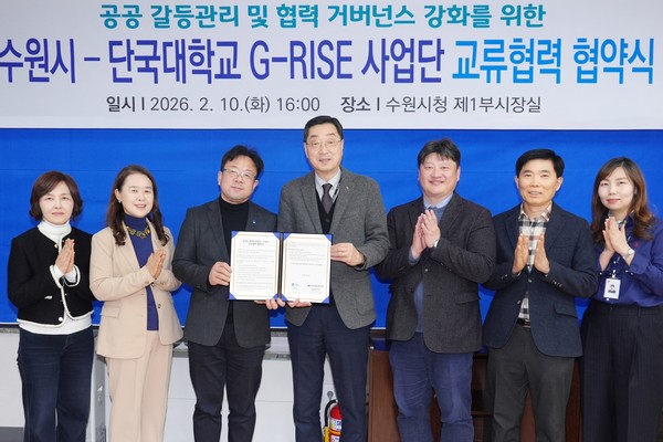공공갈등 예방·관리 협력체계 구축 통해 교육·자문·공동연구 본격 나서 단국G-RISE사업단(단장 김오영)이 수원특례시와 손잡고 공공부문 갈등을 예방하고 체계적으로 관리하기 위한 MOU를 체결했다. 이번 협약은 공공정책 추진 과정에서 발생하는 다양한 사회적 갈등에 선제적으로 대응하고, 지역사회 기반의 지속 가능한 갈등관리 체계를 구축하기 위해 마련 됐다. 협약식은 지난 10일(화) 수원특례시청에서 열렸으며 김오영 단장, 김현수 수원특례시 제1부시장 등이 참석했다. ▲ MOU 참석자 기념사진 (왼쪽 두 번째부터) 임정완 수원특례시 시민협력교육국장, 김현수 수원특례시 제1부시장, 김오영 단장, 최형준 부단장. 이번 협약을 통해 양 기관은 ▲ 공공 갈등관리 교육 프로그램 공동 운영 ▲ 정책 수립 및 제도 개선을 위한 전문 자문 ▲ 갈등관리 컨설팅 및 공동 연구 추진 ▲ 시민을 위한 평생교육 프로그램 체계 마련 ▲ 관련 정보·자료 교류 및 네트워크 구축 등에 힘을 모은다. 단국G-RISE사업단은 국무조정실 지정 갈등관리 연구기관인 분쟁해결연구센터와 함께 그동안 축적해 온 연구성과와 교육 노하우를 행정 현장에 접목한다는 목표다. 이를 통해 이를 통해 지역사회 기반 문제 해결을 위한 ‘연구–교육–현장’ 연계형 협력 모델을 강화하고, 대학의 사회적 책무를 실천하는 지역 거점 역할을 확대해 나갈 예정이다. 김오영 단장은 “이번 협약을 통해 사업단이 보유한 전문 연구 역량과 현장 경험을 바탕으로 수원특례시와 지속적인 협력을 이어 나가겠다”라며 “지역사회 갈등을 사전에 예방하고, 시민과 함께하는 소통 중심 행정 모델을 구축하는 데 적극 기여하겠다”고 밝혔다.