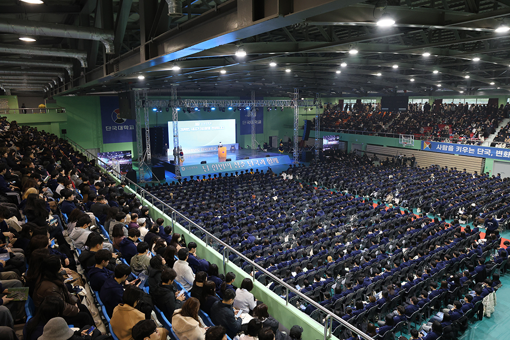 새내기 단국인 5,015명(죽전 2,567명·천안 2,448명)이 단국의 새 가족이 되었다. 학생처는 24일(화) 양 캠퍼스 체육관에서 수험생활을 마친 신입생들의 첫걸음을 내딛는 입학식을 개최했다. △ 입학식이 진행된 양 캠퍼스 체육관 전경 2026학년도 입학식에는 안순철 총장과 김오영 교학부총장, 백동헌 천안부총장, 김재일 대외부총장 등 교무위원과 총동창회 장세현 수석부회장 등이 참석해 신입생의 입학을 축하했다. △신입생 대표[죽전캠퍼스 : 김승빈(퇴계혁신칼리지)·서우정(전자전기공학전공), 천안캠퍼스 : 김민석(율곡혁신칼리지)·김다현(의예과)]가 선서를 하고있다 입학식은 단국의 역사와 미래를 담아 제작한 특별영상을 시작으로 △신입생 입학허가 선언 △신입생 대표 선서 △장학생 장학증서 수여 △총장 식사 △총동창회장 축사 △동문 환영인사 순으로 진행됐다. △ 안순철 총장이 신입생들에게 축하와 격려의 메시지를 전했다. 안순철 총장은 “우리 대학은 변화와 혁신의 DNA를 바탕으로 시대가 요구하는 인재를 길러온 대학”이라며 “인공지능과 디지털 전환의 시대 속에서 여러분이 스스로 사고하고 연결하며 새로운 가치를 만들어가는 주인공이 되길 바란다”고 말했다. 특히 “큰 목표는 하루아침에 이루어지지 않기에 ‘마부작침’의 자세로 하루하루를 성실히 쌓아간 시간이 여러분을 더욱 단단하게 성장시킬 것”이라고 격려했다. △ 특별영상을 통해 대학의 역사를 소개했다. △ 고정용 총동창회장을 대신하여 장세현 총동창회 수석부회장이 축사를 전하고 있다. 장세현 총동창회 수석부회장은 “26만 동문을 대표해 새로운 출발선에 선 여러분을 진심으로 환영한다”며 “단국의 이름으로 사회 각 분야에서 활약하고 있는 동문들이 여러분의 도전을 든든히 응원하겠다”고 밝혔다. 이어 “오늘의 각오와 다짐을 끝까지 이어가 자랑스러운 단국인으로 성장하길 바란다”고 강조했다. 우수한 성적으로 대학에 입학한 신입생 총 473명에게 △범정 △혜당 △단국인재 △글로벌인재 △성적우수 장학생으로 선발돼 장학금과 장학증서가 수여됐다. △ 안순철 총장이 대표 수상자에게 장학증서를 전달하고 있다. 범정장학생으로 선발된 김승빈(퇴계혁신칼리지)·홍승범(사학과)·김민석(율곡혁신칼리지)·박준서(영어과)와 혜당장학생으로 선발된 김시우(소프트웨어학과)·서우정(전자전기공학과)·김다현(의예과)·유호연(의예과)이 입학생을 대표해 장학증서를 각각 받았다. 범정 장학생으로 선정된 김승빈(퇴계혁신칼리지) 군은 “큰 상을 받아 아직도 실감이 나지 않지만 정말 기쁘고 초심을 잃지 않고 즐거운 마음으로 대학생활에 최선을 다하겠다”고 밝혔다. 혜당 장학생으로 선정된 김다현(의예과) 양은 “새로운 출발을 단국대에서 하게 되어 설레고 감사한 마음이 크다”며 “기대에 부응할 수 있도록 성실하게 배우고 성장하겠다”고 전했다. △ 신입생들을 위한 선배들의 다양한 공연이 진행됐다. △ 궂은 날씨에도 진행된 신입생을 위한 다채로운 프로그램