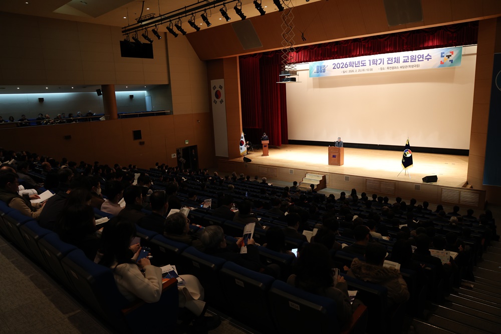2026학년도 1학기 전체 교원연수가 25일(수) 죽전캠퍼스 학생회관에서 개최됐다. 이번 연수에는 안순철 총장을 비롯해 700여 명의 교원이 참석해 새 학기 학사 운영 방향과 주요 정책을 공유했다. △2026학년도 1학기 전체 교원연수 전경 안순철 총장은 인사말에서 “학령인구 감소와 고등교육 재정 제약, AI와 디지털 전환 등 다양한 변화 속에서도 지난해 대학 평가와 재정지원사업, 산학협력, 교육환경 개선 등 모든 면에서 의미 있는 성과를 거둘 수 있었다”며 “올해는 개교 80주년을 앞두고 창학 100년을 향한 새로운 비전과 전략을 본격적으로 준비해야 하는 중요한 시점”이라고 밝혔다. △안순철 총장이 2026학년도 1학기 전체 교원연수에서 인사말을 하고 있다. 이어 “치열해지는 대학 간 경쟁 속에서 연구 성과는 대학의 위상을 결정하고 교육의 깊이와 미래 경쟁력을 좌우하는 핵심 요소”라며 “교육과 연구 현장에서 구성원 모두가 한마음으로 노력할 때 대학의 비전이 현실이 될 것”이라고 강조하고 교원들의 지속적인 협력을 당부했다. △전체 교원연수에서 2026학년도 1학기 신규 임용 교원들이 소개됐다. 이날 연수에서는 교육 성과를 격려하기 위한 베스트티칭어워드 시상이 진행됐으며, 2026년 1학기 신규 임용 교원 소개가 이어졌다. △김재일 대외부총장(대학평가전략위원장)이 대외 평가 연구지표 결과를 발표하고 있다. △남재걸 기획실장이 학과평가 추진 방향에 대해 발표하고 있다. 또한 대학 주요 정책과 운영 방향을 공유하는 발표가 진행돼 ▲2025학년도 주요 대외평가 연구지표 결과(대학평가전략위원회) ▲학과평가 추진 방향(기획실) ▲2026학년도 교무 운영 계획(교무처) 등이 제시됐다.